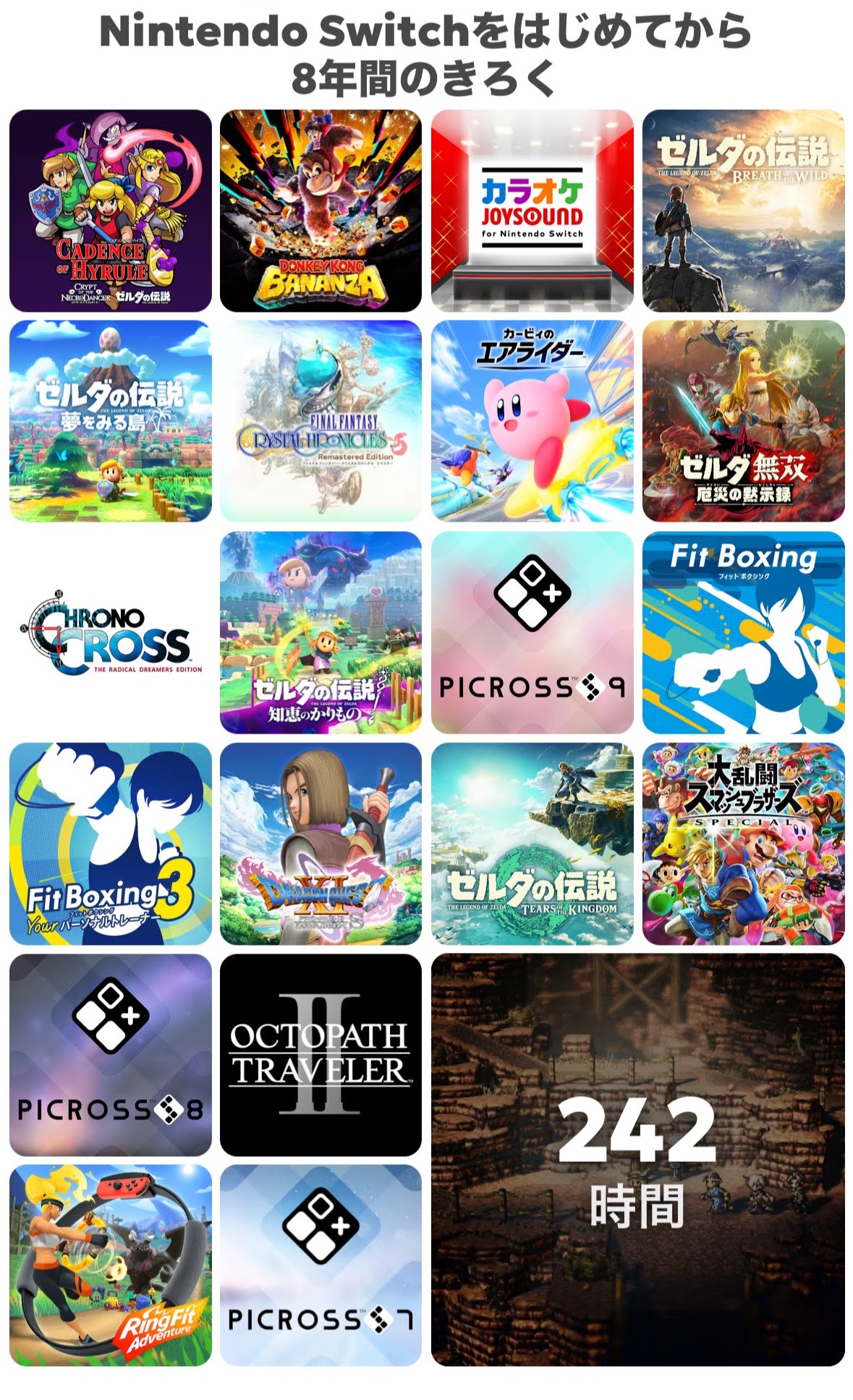 スイッチの記録だとゼルダ、オクトラ、ピクロス、フィットネス系!というラインナップですね…。オクトラ1が多分一番長くプレイしてるかな。3周目途中+ロケハンで242時間か…。