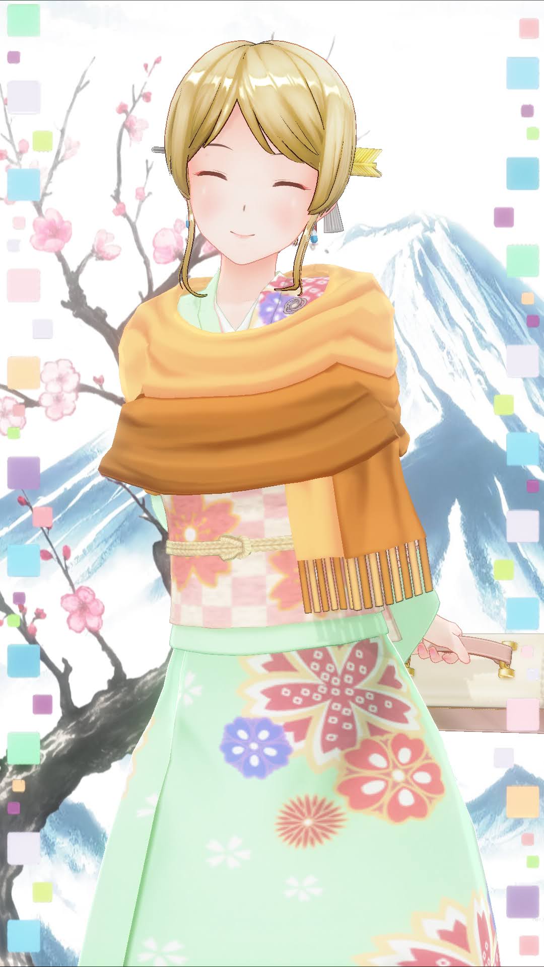 >>1384 前回から髪型や顔を少し変えてます(笑顔だから分かりづらいけど)。着物はコスチュームのセットで一番似合うと思った淡い緑色を選びました。確かアートブックでも緑や青のデザイン案が載っていたので、基本的に寒色系のイメージがあります。畳む